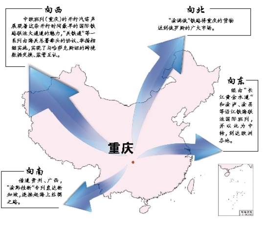????重慶向東沿長(zhǎng)江出太平洋可連接亞太經(jīng)濟(jì)圈,向西通過(guò)中歐(重慶)國(guó)際鐵路大通道、向北通過(guò)渝滿俄通道分別經(jīng)中亞、俄羅斯可進(jìn)入歐洲經(jīng)濟(jì)圈,向南通過(guò)中新南向鐵海聯(lián)運(yùn)新通道經(jīng)廣西和云南可達(dá)印度洋,戰(zhàn)略樞紐作用極為重要。