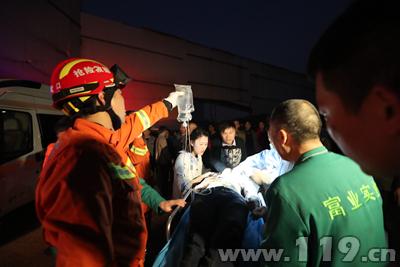 ????一名男子被卷進軋鋼機傳送帶的卷軸內,胸口與左手在卷軸頂端處撕裂,傷情嚴重!重慶大渡口區消防支隊八橋中隊救援官兵和120急救人員,一邊安撫男子情緒,一邊給男子輸液,防止休克。