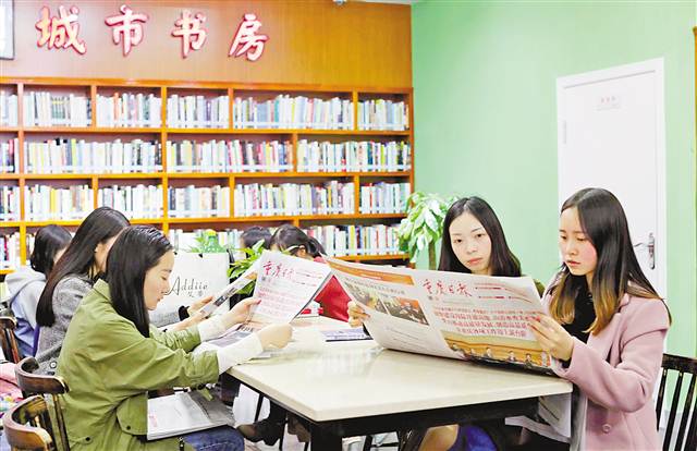 3月11日,沙坪壩區(qū)圖書(shū)館在三峽廣場(chǎng)的“24小時(shí)城市書(shū)房”,讀者通過(guò)《重慶日?qǐng)?bào)》學(xué)習(xí)習(xí)近平總書(shū)記參加重慶代表團(tuán)審議時(shí)所作重要講話的精神。通訊員 孫凱芳 攝