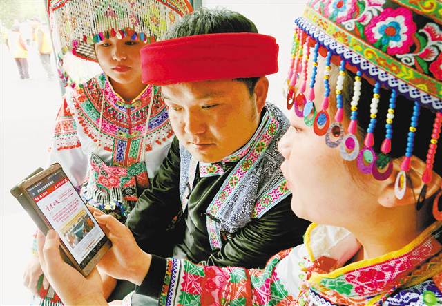 3月11日,萬(wàn)盛經(jīng)開(kāi)區(qū)關(guān)壩鎮(zhèn)涼風(fēng)村,從事鄉(xiāng)村旅游業(yè)的苗族村民在手機(jī)上閱讀《重慶日?qǐng)?bào)》電子版,學(xué)習(xí)習(xí)近平總書(shū)記參加重慶代表團(tuán)審議時(shí)所作重要講話的精神。特約攝影 曹永龍