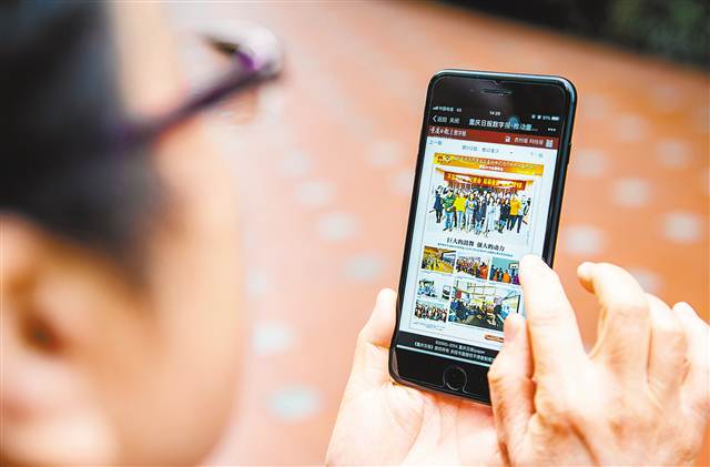 三月十一日,渝北區,一市民正通過手機閱讀《重慶日報》電子版,學習貫徹習近平總書記參加重慶代表團審議時的重要講話精神。記者 齊嵐森 攝