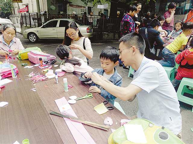 5月11日,大渡口區九宮廟街道新工社區舉辦母親節活動,小朋友和爸爸一起制作一束康乃馨。記者 羅靜雯 攝