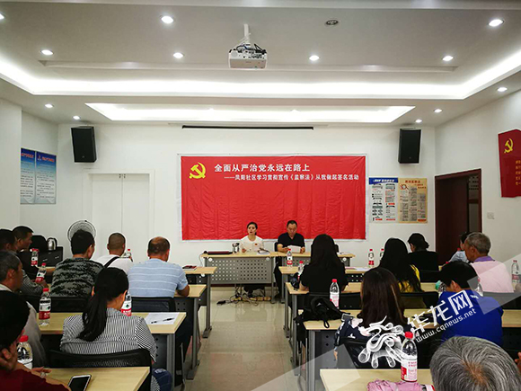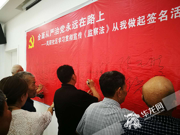 ????5月18日,一場(chǎng)大雨,吹散了多日的炎熱,吹來(lái)了山城人民期盼已久的涼風(fēng)。而一場(chǎng)黨員教育的“清風(fēng)”,也吹入了重慶市大渡口區(qū)八橋鎮(zhèn)鳳陽(yáng)社區(qū)流動(dòng)黨員們的心里。5月18日上午,在大渡口區(qū)鳳陽(yáng)社區(qū),以“全面從嚴(yán)治黨永遠(yuǎn)在路上”為主題,鳳陽(yáng)村和鳳陽(yáng)社區(qū)聯(lián)合開展的“學(xué)習(xí)《中華人民共和國(guó)監(jiān)察法》從我做起”簽名活動(dòng)正式舉行,奏出了一曲社區(qū)人文環(huán)境和諧的新樂(lè)章。