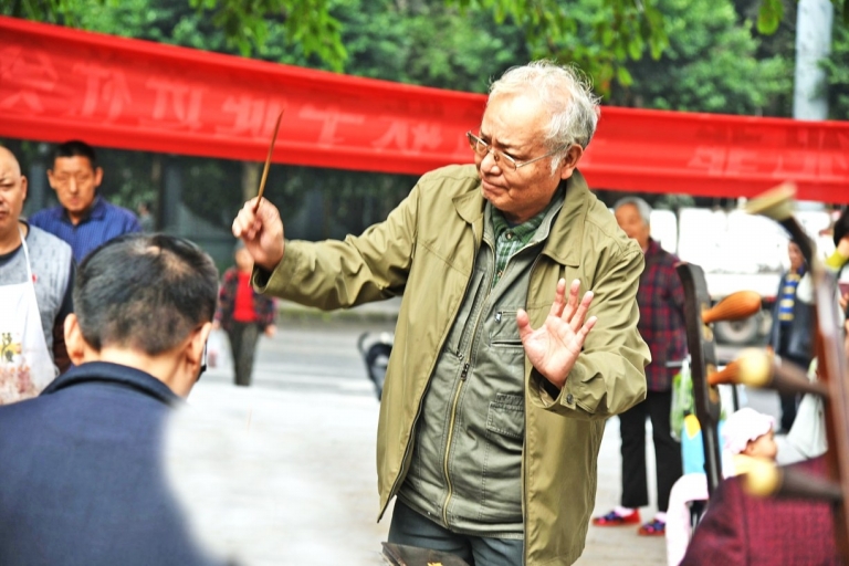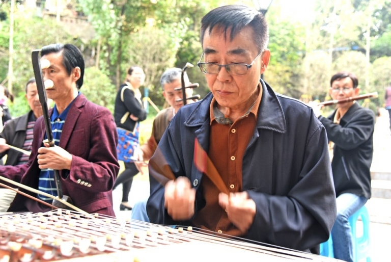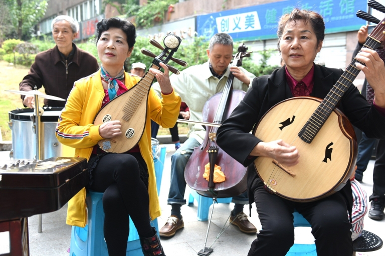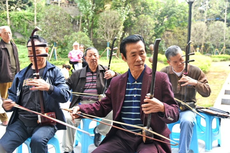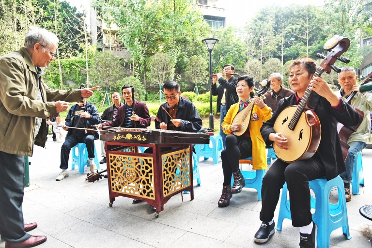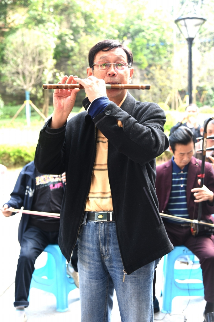 ????原來這是一支由居民自發組成的民樂隊,樂團演出時的風格與穿著頗有“軍樂團”的范兒,而且喜歡用自己演奏的樂器互相稱呼。笛子、揚琴、二胡、大阮、大提琴、打擊樂等東西方樂器在他們手中得到了完美的融合,每次演出都能收獲掌聲無數。