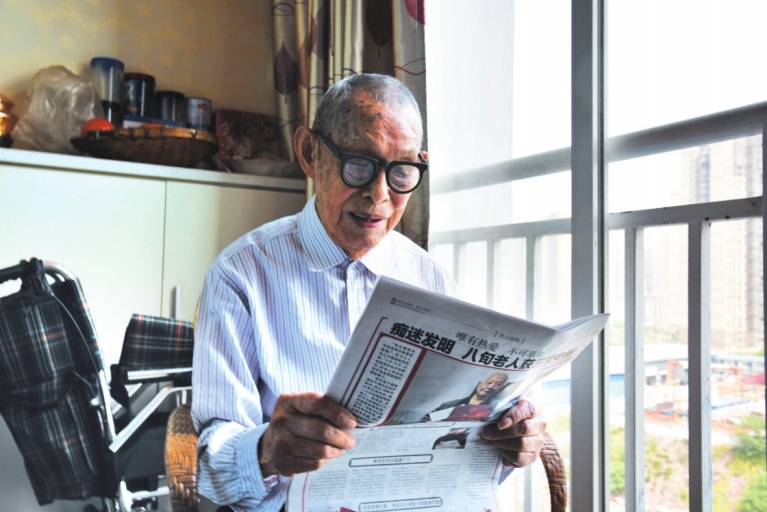 ????房間的正中央,一位穿戴一新的老人,端端正正坐在一張藤椅上,鐵銹紅的斜襟上衣與后面的大紅“壽”字相映襯,很是喜慶。原來,這位老人叫陳海榮,今天是他100歲的生日,老人的子孫們和周圍鄰居紛紛趕來為老人慶生。