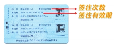 ????具體要看電子往來港澳通行證背面的簽注內容。以下圖為例,持證人同時辦理了赴港、赴澳簽注,簽注有效期均為1年,次數為“一次往返有效”。這表示在簽注規定時間內,持證人可以分別往返一次香港及澳門。一旦此簽注被使用,或者持證人在規定時間內并未前往港澳,則此簽注無法再使用,如果有出行計劃,持證人需要重新申辦新的簽注。