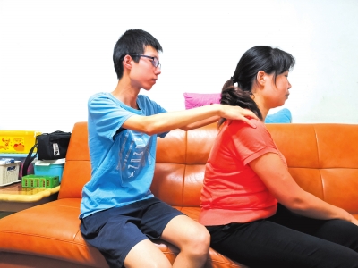 ????不會做飯,他便在一旁認真地觀察媽媽做的每一個步驟,晚飯后和媽媽一起折疊衣物,袖子折過來,衣領翻好,他嘗試著把這些細節做得更好。不忍心看到媽媽的肩痛病復發時候的痛苦不堪,他便上網學習如何緩解肩痛病的疼痛,等到媽媽下班回去,唐玉成端了一盆熱水,用毛巾在媽媽肩膀上熱敷之后再按摩,看到這個方法能減輕媽媽的肩痛,他露出一絲笑容,對媽媽說:“從今以后你的小按摩師上線了。”