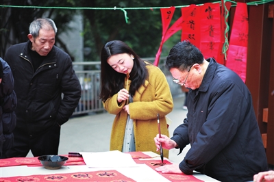 ????當天早上,聞訊而來的居民聚集在區博物館門口。活動現場,工作人員將活靈活現的糖畫和書法愛好者們寫的春聯遞到居民手中,空氣中彌漫著喜慶的味道。