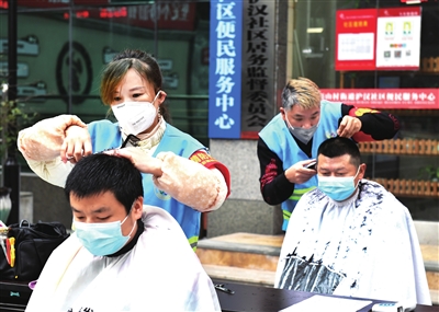 ????(記者 張永香/文 龍?jiān)谌?圖) “咔嚓!咔嚓!”2月14日上午,新山村街道滬漢社區(qū),身穿“藍(lán)色馬甲”的理發(fā)師志愿者正在熟練地理發(fā)。一把剪刀,一把推子,一把梳子,一張圍布,新山村街道專門為抗疫一線工作人員設(shè)立的“理發(fā)店”就開張了。
