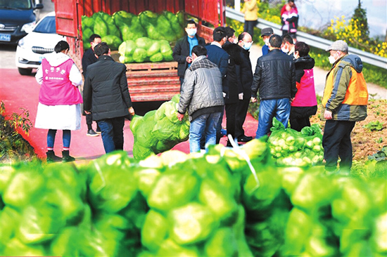 2月24日,大渡口區農業農村委、區城市管理局、團區委組織志愿者前往跳磴鎮金鰲村,從50余戶菜農地里收購了7000余斤新鮮蔬菜。當天下午,7輛滿載蔬菜的卡車開進區固體廢棄物運輸有限公司,將“蔬菜包”免費送到了環衛工人手中。
