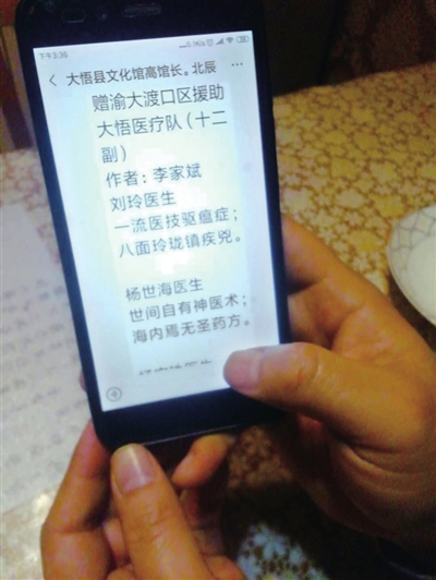 ????其中送給李荷醫生的藏頭詩里寫道:“李白桃花天使美,荷清心慧杏林香”劉琳告訴記者,“我長這么大從來還沒有收到過送給自己的詩。更何況是自己名字的藏頭詩,我激動得還把這首詩通過電話念給了自己的兒子聽。回家后,我還要把這首詩裝裱起來,掛在自己的客廳里!”