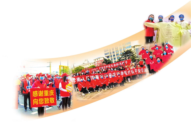 ????為了歡送重慶赴孝感支援隊669名首批撤離隊員回家,孝感市以及所轄各個區縣舉行了最隆重、最盛大的歡送儀式。孝感人民全城出動,夾道數十里前來送別,他們扶老攜幼站在道路兩旁,用各自的方式向英雄們致敬。