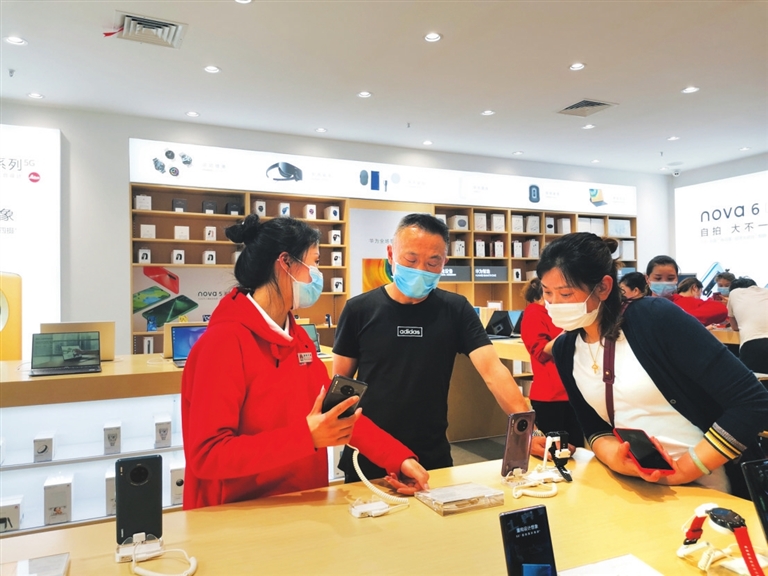 ????據(jù)了解,這家店于3月6日復(fù)工,不同款式的手機(jī)有相應(yīng)的直降活動(dòng),直降范圍在300元到500元不等。“進(jìn)店咨詢的顧客每天平均上百位。”商家負(fù)責(zé)人介紹,針對(duì)每位顧客的具體需求,他們也會(huì)推薦適合的產(chǎn)品。除了手機(jī),還有智能手環(huán)、藍(lán)牙音箱、耳機(jī)、筆記本電腦等可供顧客選擇。