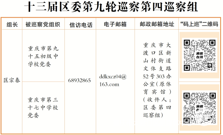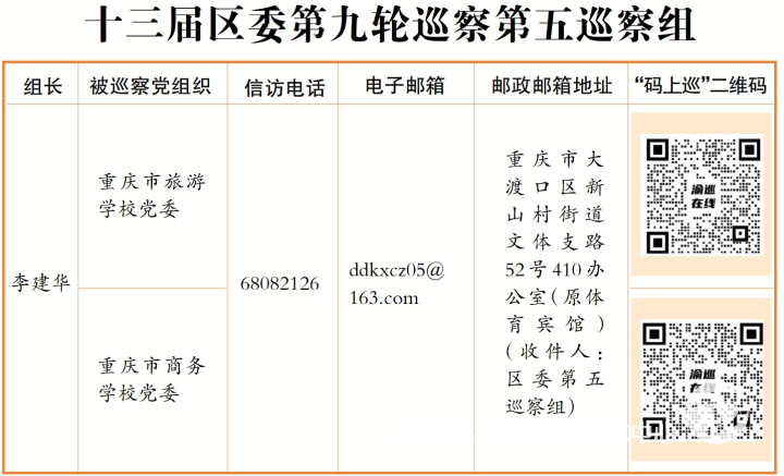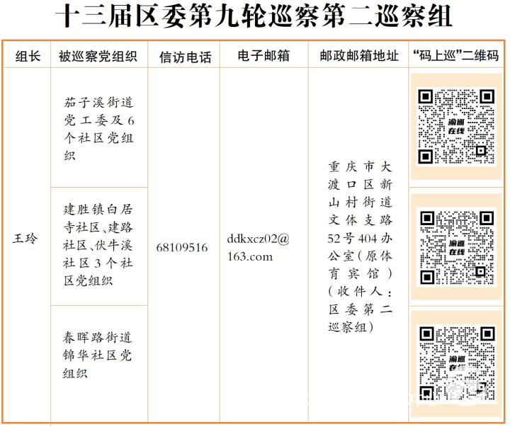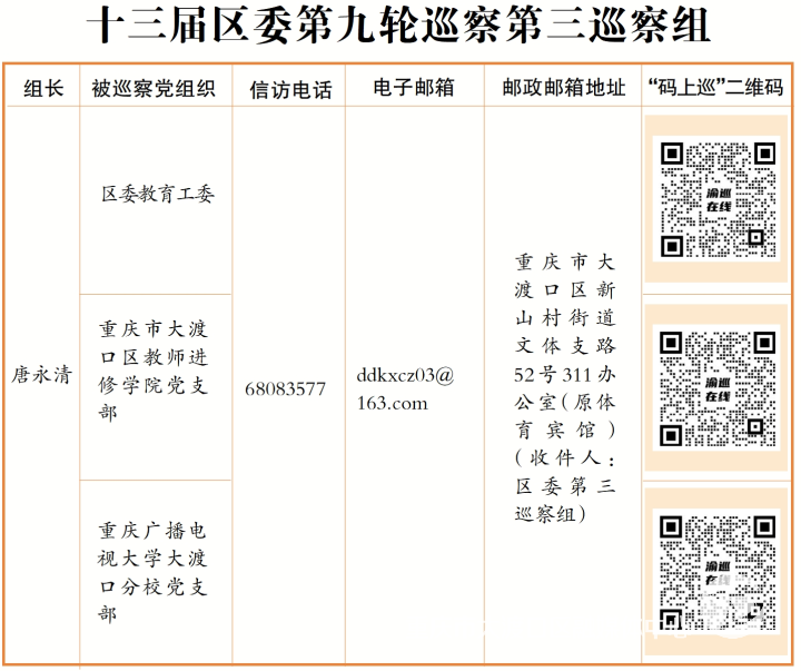 巡察期間,巡察組設有專門的聯系電話、電子郵箱、郵政信箱和巡察二維碼,歡迎廣大黨員、干部、群眾向巡察組反映問題、提供線索。信訪受理截止時間為2025年11月14日,舉報電話接聽時間為工作日9時至18時。巡察組主要受理反映被巡察黨組織領導班子及其成員、其他區管干部、內設部門負責人、下一級單位班子成員及其他重要崗位干部問題的來信、來電、來訪,重點是關于違反政治紀律、組織紀律、廉潔紀律、群眾紀律、工作紀律、生活紀律等方面的舉報和反映。其他不屬于巡察受理范圍的信訪問題,將按規定轉有關部門處理。